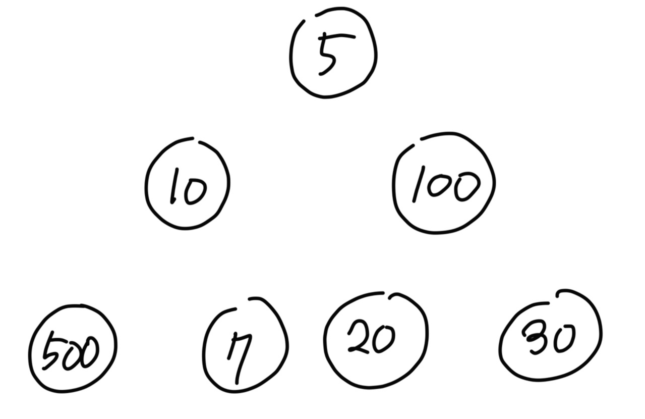 다음과 같이 위에서 아래로 이동하면서 거쳐가는 노드의 합이 가장 큰길을 찾고자 한다면