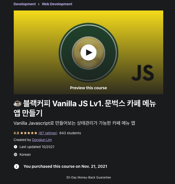 바로 바로 ☕ 블랙커피 Vanilla JS Lv1. 문벅스 카페 메뉴 앱 만들기이다.