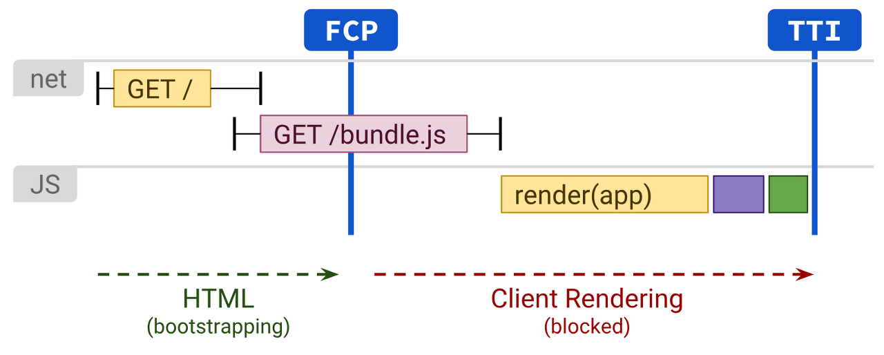 서버가 아닌 클라이언트에서 처리가 됩니다. 완전히 실행이 다 되면 사용자는 화면을 볼 수 있고 작동을 시킬 수 있습니다.
