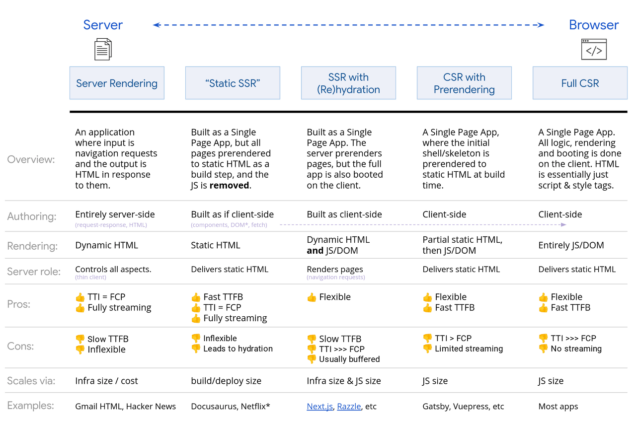 공식 문서와 같은 static하고, 페이지의 변화가 없는 사이트에는 빌드시 HTML를 만들어놓고 들어오는 사용자에게 제공하는 prerendering 같은 방식을 사용할 수 있고,
