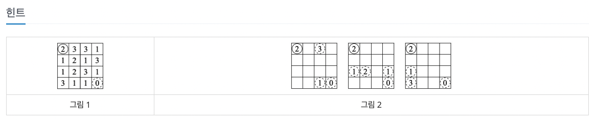각 칸에 적혀있는 수는 현재 칸에서 갈 수 있는 거리를 의미한다. 반드시 오른쪽이나 아래쪽으로만 이동해야 한다. 0은 더 이상 진행을 막는 종착점이며, 항상 현재 칸에 적혀있는 수만큼 오른쪽이나 아래로 가야 한다. 한 번 점프를 할 때, 방향을 바꾸면 안 된다. 즉, 한 칸에서 오른쪽으로 점프를 하거나, 아래로 점프를 하는 두 경우만 존재한다.