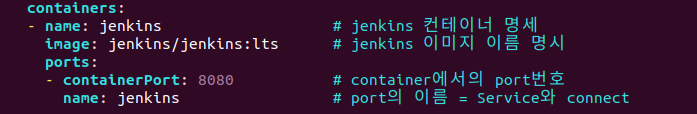 이 파드 컨테이너의 포트는 8080번지를 대상으로하고, 이름을 jenkins라고 명시해주어서