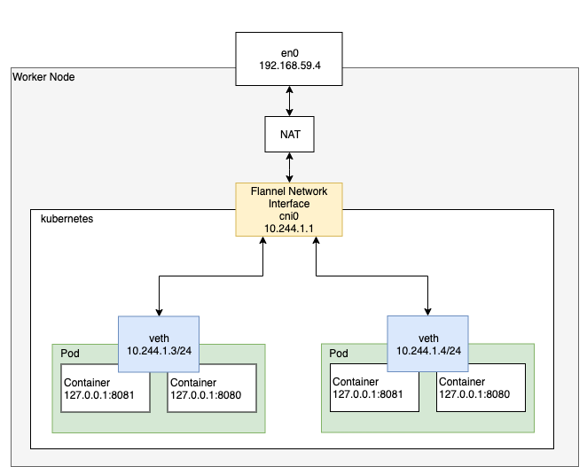 kubelet의 기본 네트워크 플러그인 CNI로 구성된 네트워크 인터페이스를 통하여 고유한 IP 주소로 서로 통신할 수 있다.