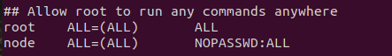 이것이 의미하는 것은 "node" 라는 user에게는 root의 권한이 필요할 때 패스워드를 요구하지 않는다.
