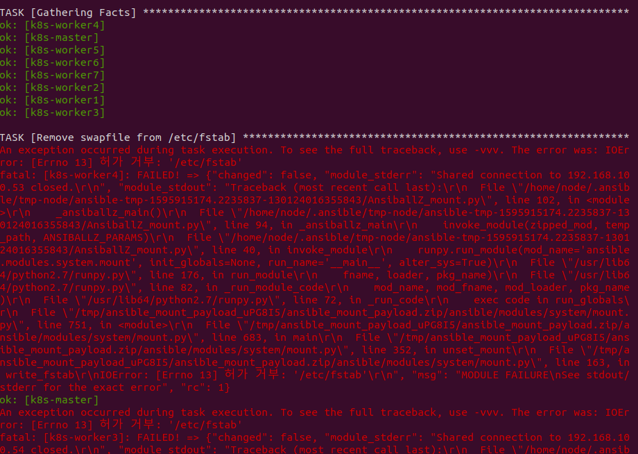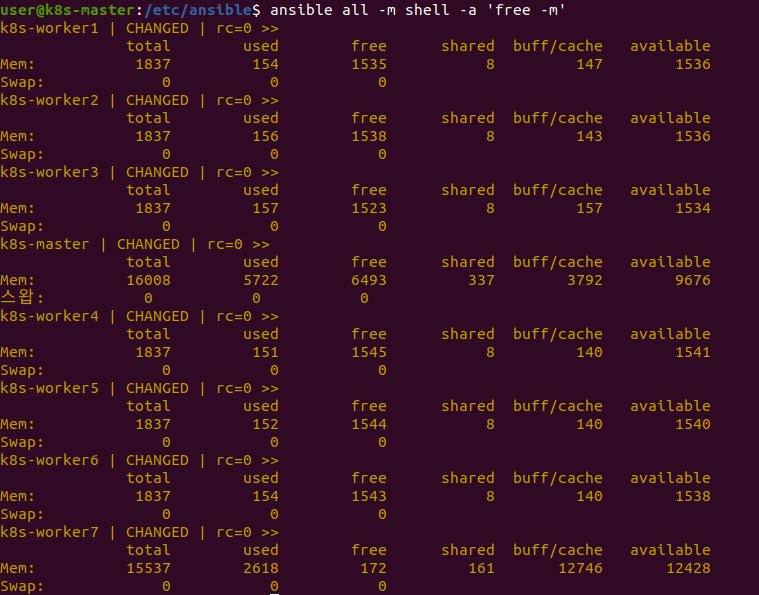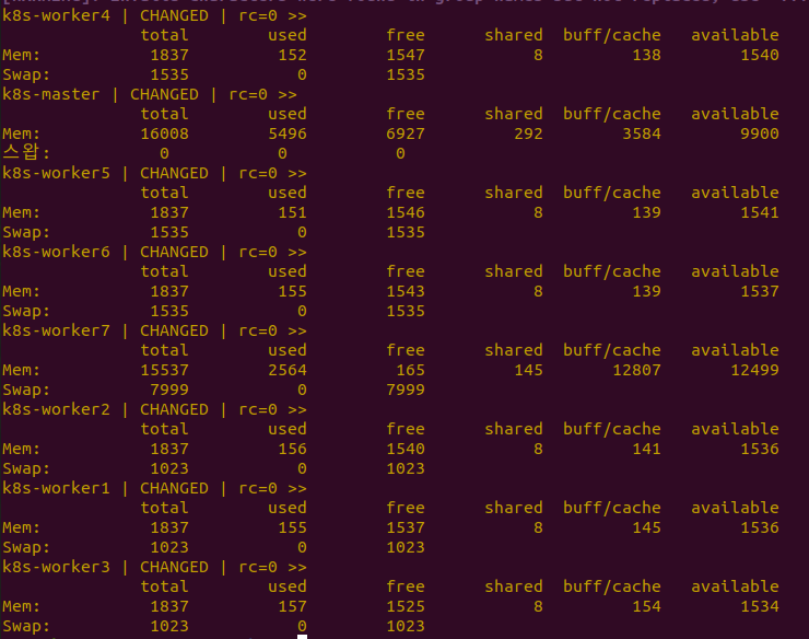 조금 더 깔끔하게 ansible로 명령을 내려서 한꺼번에 swapoff를 하는 것을 해보고 싶었습니다.