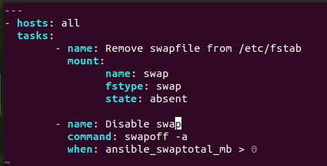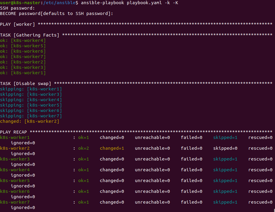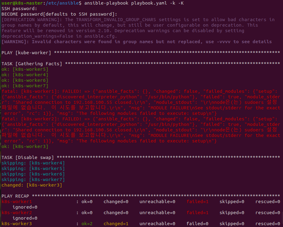 를 통해서 playbook을 실행시키면 전부 swapoff가 적용이 되었고