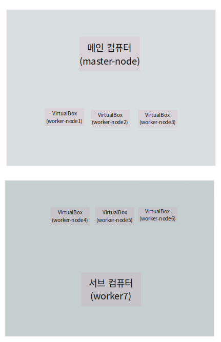 메인컴퓨터에 Virtual Box를 3개 설치해서 워커 노드를 구성