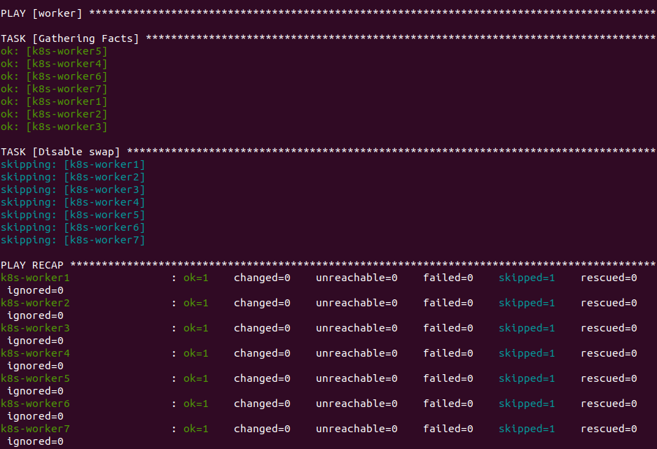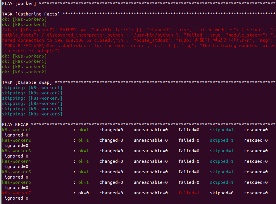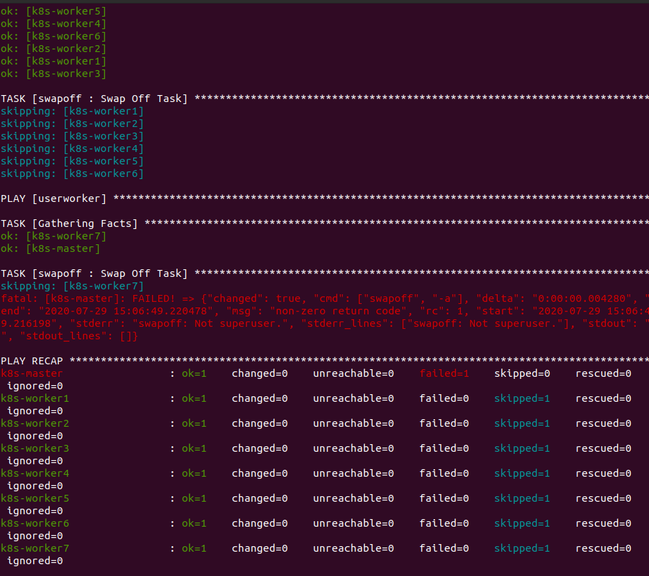 ansible에서 적어놓은 roles 폴더 구조처럼 사용하지 않으면 위와 같이 Swap Off Task를 수행을 안하는 것을 볼 수 있습니다.
