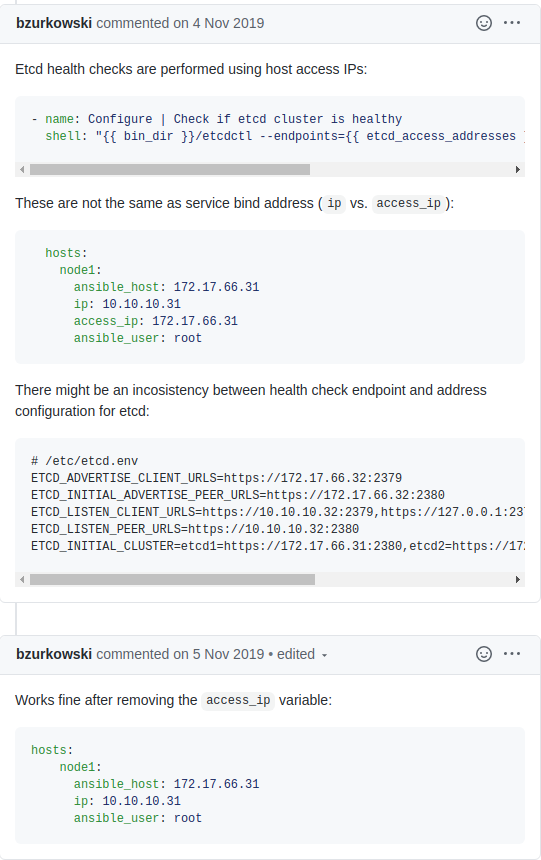 상태 점검 endpoint와 etcd에 대한 주소 구성간에 불일치가 있을 수 있다고 합니다..