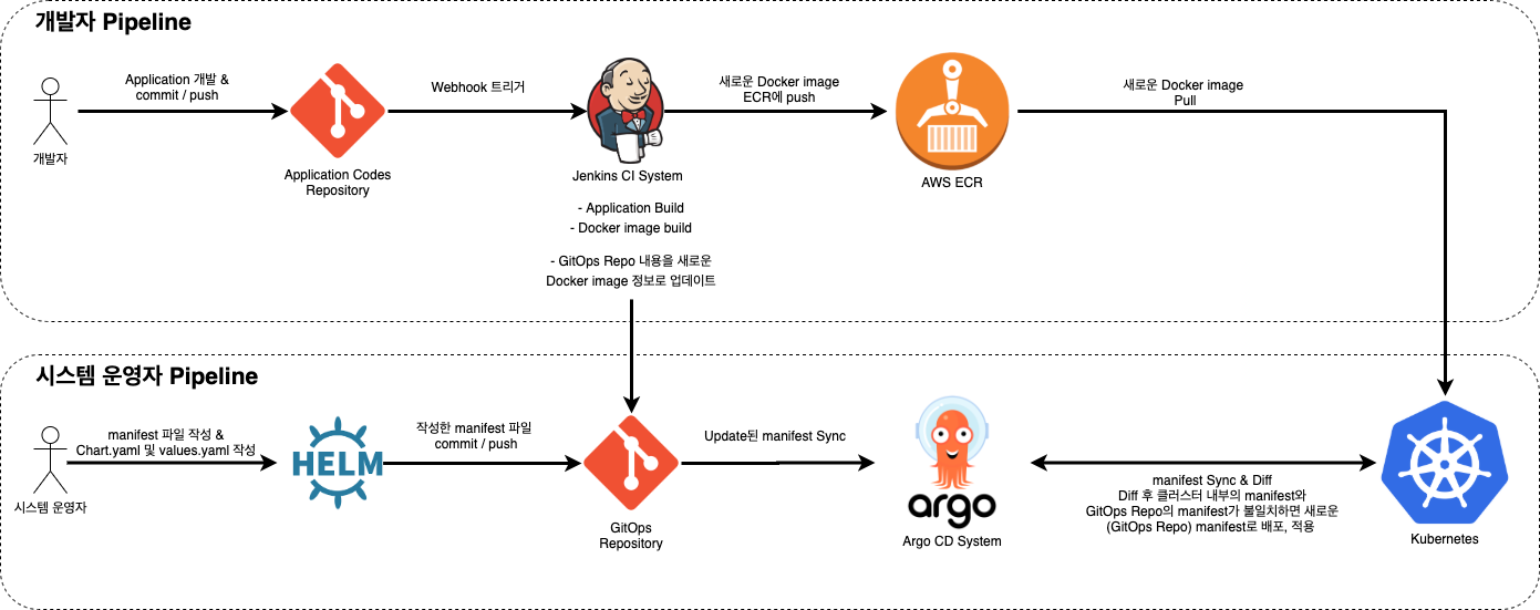그리고 Argo CD에서는 새로 업데이트된 GitOps 리포지토리의 내용을 감지해서 현재 쿠버네티스에 배포된 manifest 내용과 새로 업데이트된 GitOps 리포지토리의 manifest 내용을 비교(Diff)하여 업데이트 된 내역을 확인하면 운영자의 조작에 따라서 혹은 자동으로 업데이트된 내용을 적용(Sync) 하여 쿠버네티스에 배포합니다.