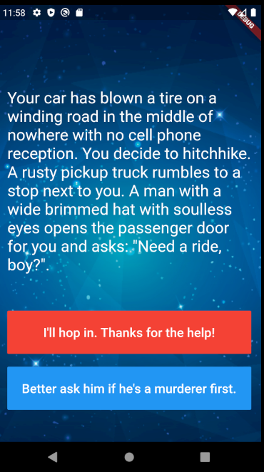 스토리가 주어져있고 그 밑에 버튼이 두 개있어서 사용자가 선택을 어떻게 하느냐에 따라 스토리가 달라지는 애플리케이션을 만들었습니다.