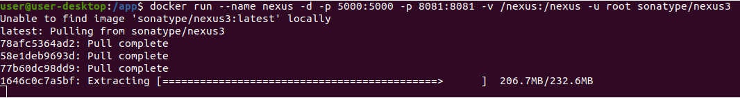 $ docker run --name nexus -d -p 5000:5000 -p 8081:8081 -v /app/nexus-data:/nexus-data -u root sonatype/nexus3