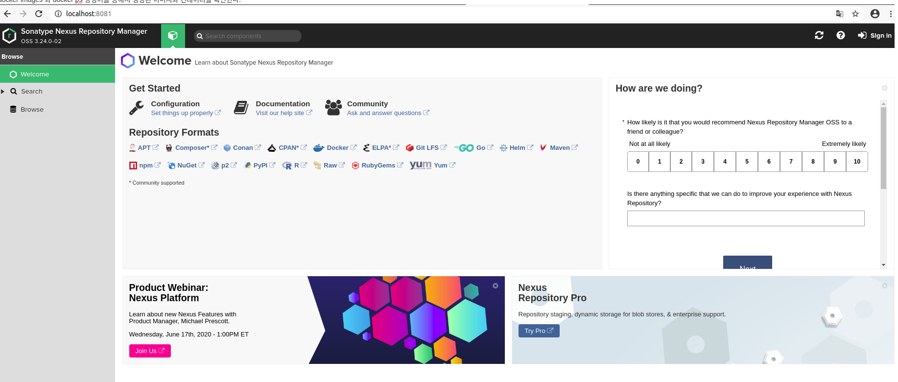 Nexus3의 default 포트번호는 8081 이기 때문에 localhost:8081로 접속하면 저런 화면이 뜰 것이다.